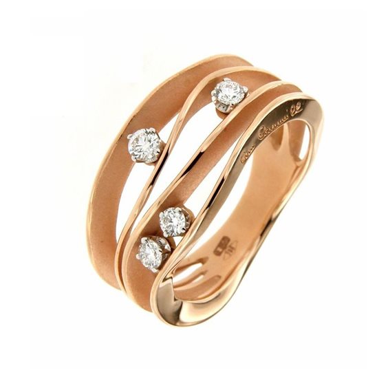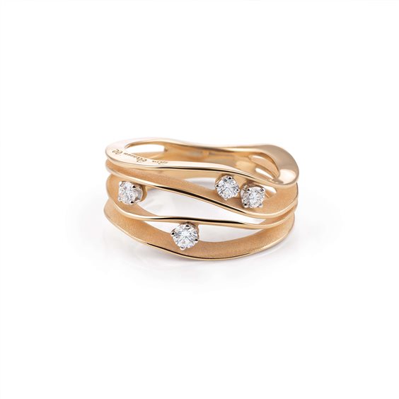 L’anello Annamaria Cammilli Dune GAN0778J è realizzato in oro arancio 750 /°° con diamanti naturali, un gioiello di eccezionale eleganza. Collezione principale della famiglia Essential, Dune descrive nelle sue curve irregolari il dinamismo delle dune del deserto, illuminate da preziosi diamanti a taglio brillante incastonati tra i morbidi movimenti. Le preziose alternanze dei sottili e irregolari fili di oro, opaco sulle profondità e lucido sui bordi, sono le caratteristiche della collezione. Esse donano profondità al gioiello, riproducendo il contrasto di luci ed ombre delle dune irraggiate dal sole.