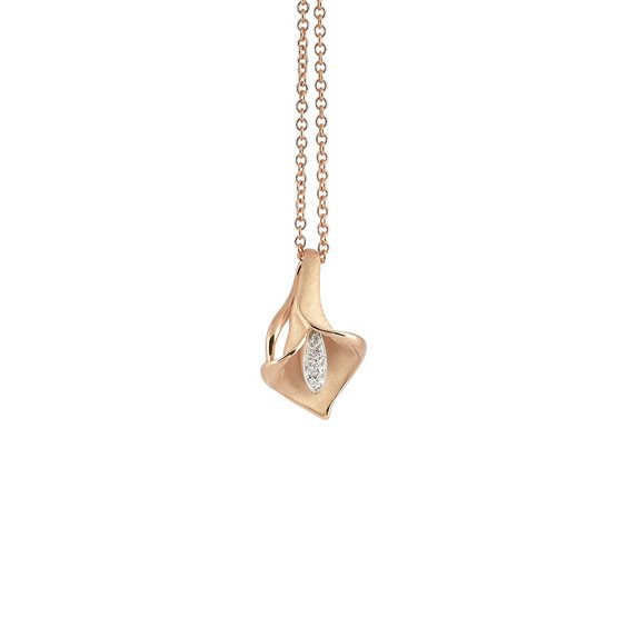 Girocollo in oro arancio apricot 750/°°° linea CALLA di Annamaria Cammilli, con pendente a forma di calla con all'interno un pistillo incassato con diamanti dal peso complessivo di kt. 0,05. Lunghezza catena cm. 40. Il tutto corredato di garanzia personalizzata ed elegante custodia con coperchio in alabastro.