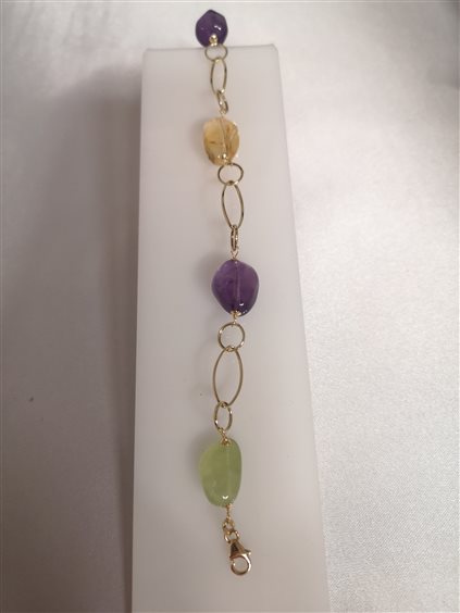 Bracciale in oro giallo 750/°°° ad anelli intercalati con pietre dure ( ametista, topazio giallo e peridoto) lungo cm.20, peso complessivo gr. 10,7