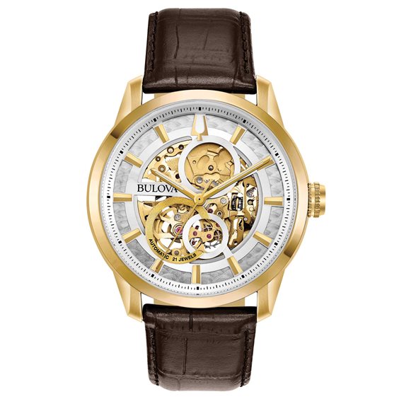 Orologio Solo Tempo Bulova Meccanico modello Sutton Scheleton. Cassa in acciaio placcata oro giallo (YPGOLD) lucido, fondo con vista movimento. Movimento meccanico automatico 21 rubini riserva di carica 40 ore. Quadrante con vista movimento scheletrato, indici e lancette luminescenti placcati oro giallo con bordo argento. Vetro minerale. Cinturino in pelle marrone stampa alligatore, fibbia deployante con pulsanti. Impermeabile 3 bar (3 atm). Scatola libretto istruzioni e garanzia 5 anni originali.