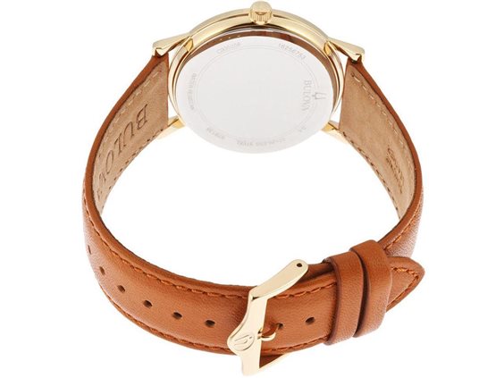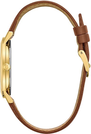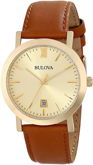 Orologio da uomo al quarzo in acciaio laminato oro giallo, quadrante champagne con datario a ore 6.Sferino secondi al centro. Cinturino in pelle marrone.