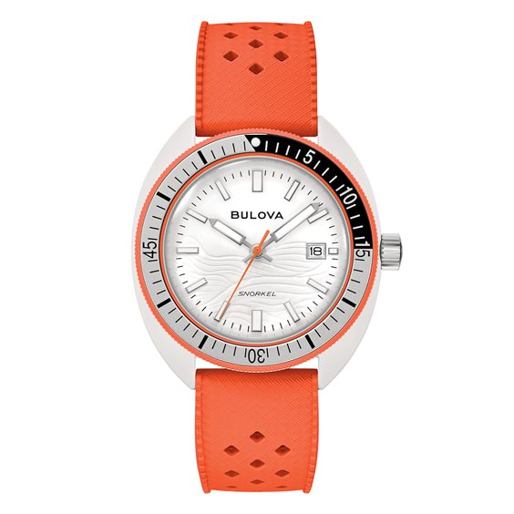 Snorkel “Clownfish” - limited edition. Iconico, brillante, inconfondibile. Lo Snorkel Clownfish prende vita dal contrasto grafico del celebre pesce pagliaccio: cassa bianca in Hybrid Ceramic, quadrante opalino con onde incise, e dettagli arancio acceso su cinturino, ghiera e lancetta dei secondi. La lunetta bicolore e il réhaut nero danno un tocco tecnico, mentre il cinturino in gomma arancione traforata, con interno in Cordura®, assicura comfort e personalità. Un diver dal look solare e deciso, pensato per chi ama distinguersi senza perdere il legame con il mare.