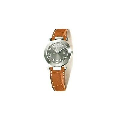 Orologio da donna marca Longines, cassa rotonda in acciaio, vetro zaffiro, quadrante colore antracite con numeri arabi, datario a ore 3, movimento al quarzo svizzero, cinturino in pelle di alligatore con chiusura a fibbia.