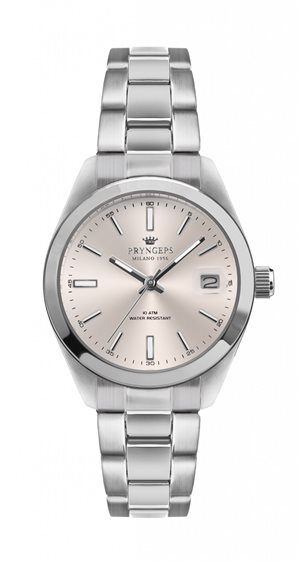CASSA Acciaio diametro 33 mm, water resistant 10 ATM, corona serrata a vite personalizzata, crystal coated sapphire, fondello acciaio serrato a vite, lunetta in acciaio, Spessore della cassa mm 9,85 QUADRANTE Cipria, verde, nero, blu o bianco, indici in rilievo, logo in rilievo, datario al 3, solo tempo BRACCIALE Acciaio solido, ansa 16 mm, chiusura butterfly con fermaglio di sicurezza MOVIMENTO Miyota A1072 - QUARTZ TORINO ACCIAIO BRACCIALE SOLIDO DONNA cipria Qtà: 1