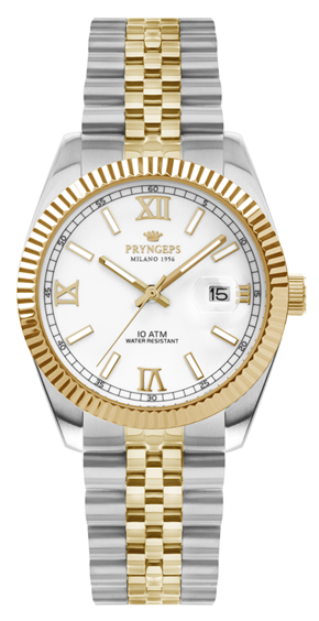 Cassa Acciaio bicolore diametro 32 mm, water resistant 10 ATM, crystal coated sapphire, fondello acciaio serrato a vite, lunetta in acciaio, mm 9,85 Quadrante Verde, nero o bianco, cifre romane con indici, indici applicati, logo in rilievo, datario al 3, solo tempo Bracciale Acciaio solido bicolore, ansa 16 mm, chiusura a scomparsa personalizzata Movimento Quartz, Miyota