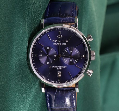 Orologio dalle seguenti caratteristiche: CASSA Acciaio diametro 41 mm, water resistant 5 ATM, corona serrata a pressione personalizzata, crystal coated sapphire, fondello acciaio serrato a vite, lunetta in acciaio, Spessore della cassa mm 11,54 QUADRANTE Blu, indici applicati, datario al 6 BRACCIALE In pelle con chiusura a fibbia personalizzata. MOVIMENTO Chrono quartz, Seiko VK64