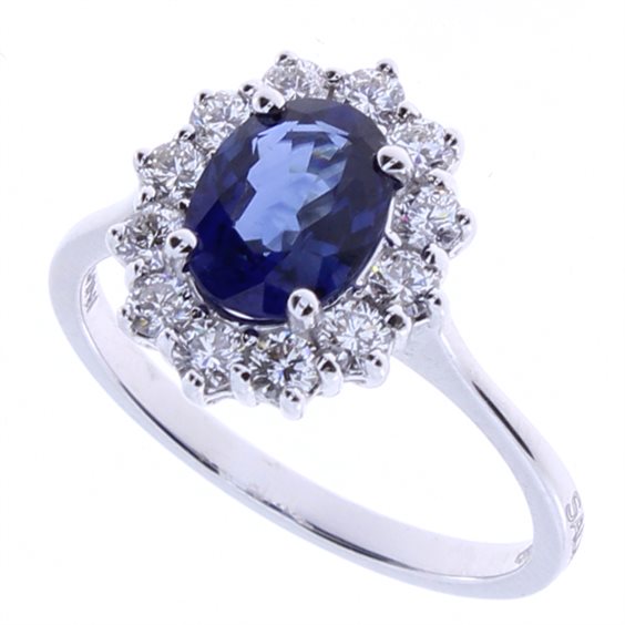 Anello in oro bianco 750/°°° con zaffiro blu ovale provenienza Ceylon kt 1,65 e diamanti di contorno dal peso complessivo di kt. 0,54 G VS