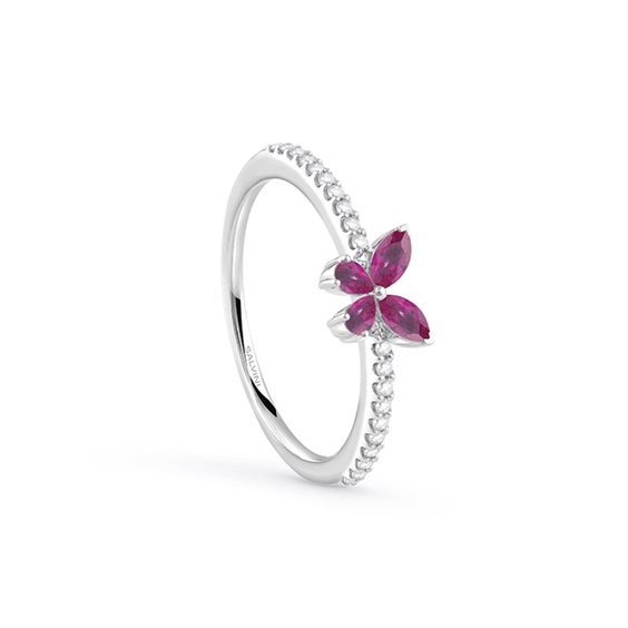 Anello con farfalla della collezione Libera in oro bianco con rubino di caratura 0,40 e diamanti a taglio rotondo di caratura 0,11 di colore GH.