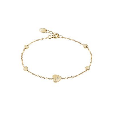 bracciale a catena con serie di cuori. il cuore centrale ha un piccolo diamante da 0,01 carati. oro giallo di 9 carati. misura 18 regolabile