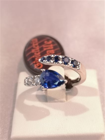 Anello in oro bianco 750/°°° a forma di serpente con zaffiro blu a goccia al centro e ai lati sul gambo da una parte zaffiri e dall'altro diamanti. Caratura complessiva zaffiri 1,88 e diamanti 0,31. Peso oro gr. 5,60. Misura 15. Corredato di garanzia ed elegante custodia.