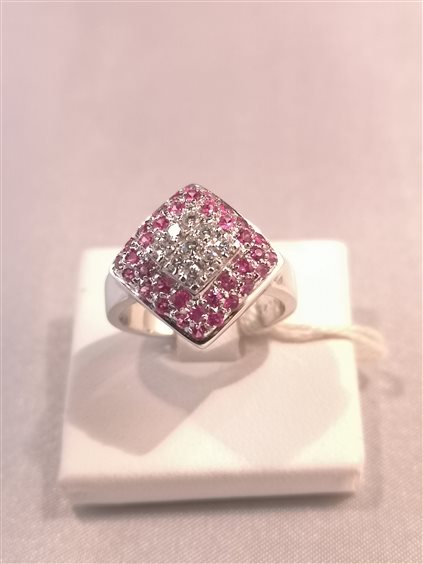 Anello in oro bianco 750/°°° a forma di rombo con incassato al centro diamanti per una caratura complessiva di 0,23 e attorno incassati degli zaffiri rosa per un caratura complessiva di 0,82. Misura anello 14